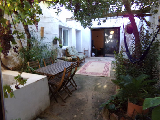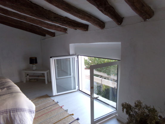 On entrance is a cosy lounge with open fireplace and beamed ceilings, with a stairway leading to two bedrooms, with a small terrace. The bathroom is downstairs with a small utility room, leading to an internal patio with a spacious seating, and dining area with plunge pool, and a lovely feature with overhead grapevines!