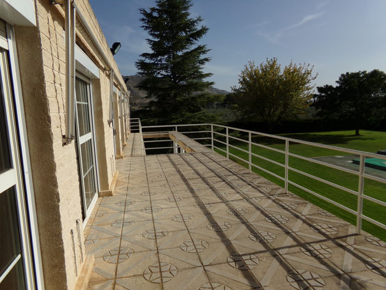 The villa is set in grounds that are fully fenced with electric gates , and a sweeping driveway and private road. manicured lawns, flowerbeds and trees. And a magnificent pool . There is also a separate party room with BBQ/kitchen with bathroom, with floodlights perfect for entertaining and parties. It has even hosted a wedding venue!